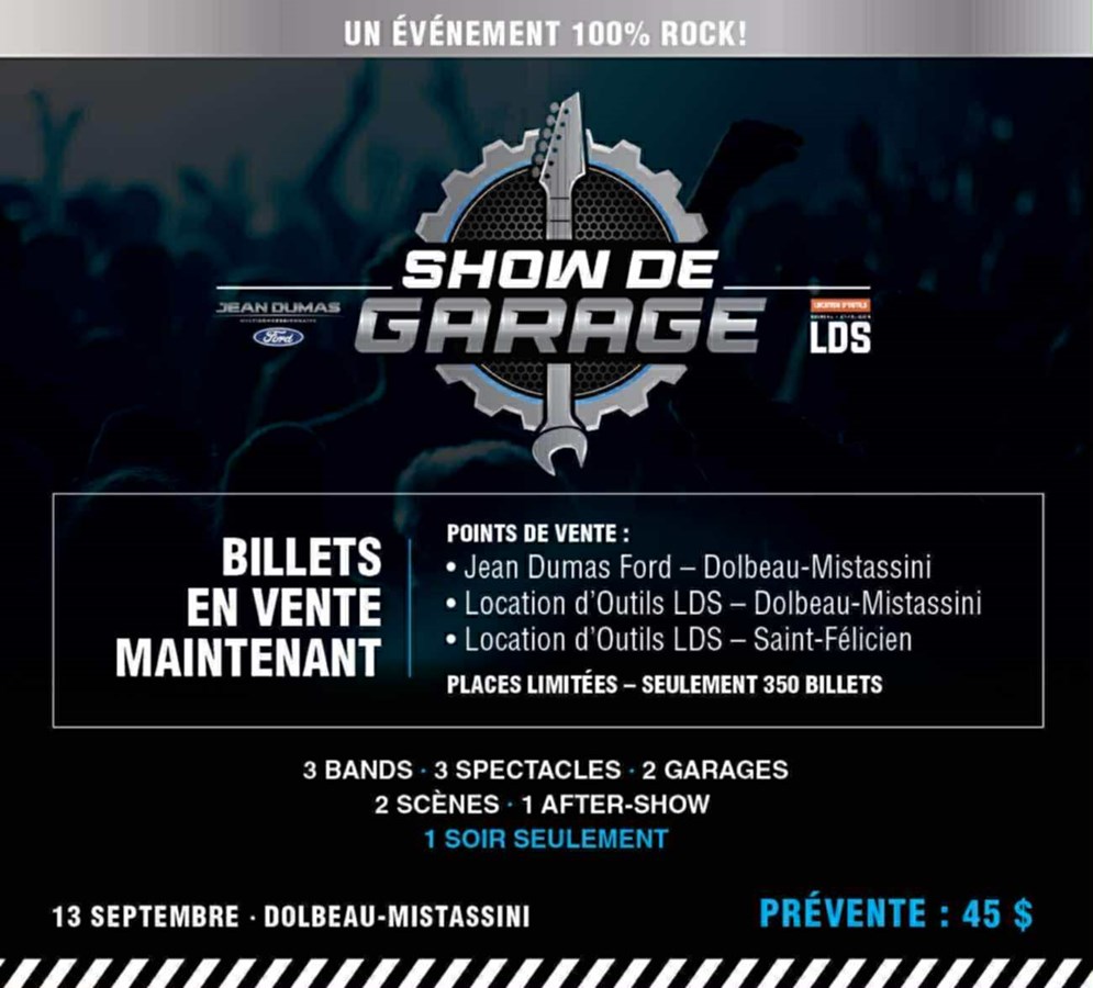 Le 13 septembre prochain sera présentée la première édition du Show de Garage. Un concert rock mettant en vedette trois artistes mystères, organisé au profit d’associations régionales et présenté dans les établissements de Location D’Outils LDS et Jean Dumas Ford.
