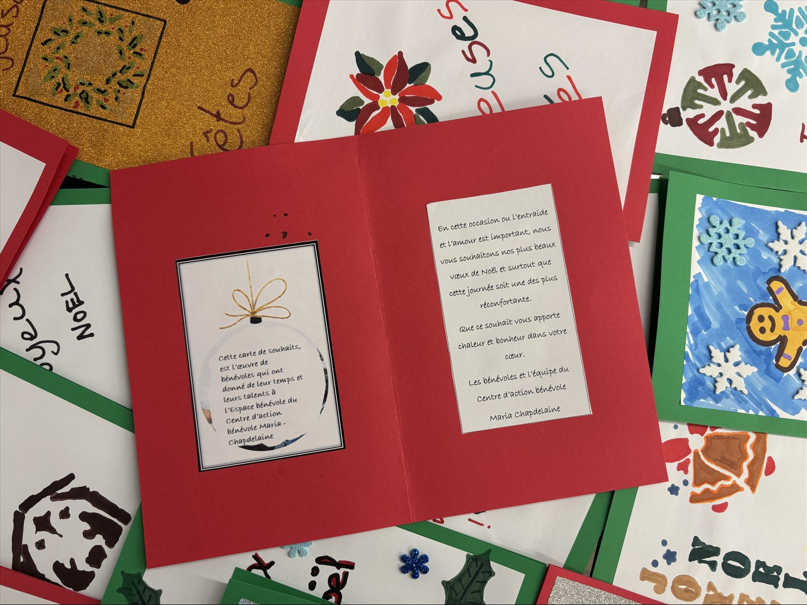 Pendant le temps des Fêtes, ceux qui réalisent les appels d’amitié pourront transmettre des cartes de Noël aux bénéficiaires, réalisées dans l’espace bénévole avec l’aide de Catherine Dion.