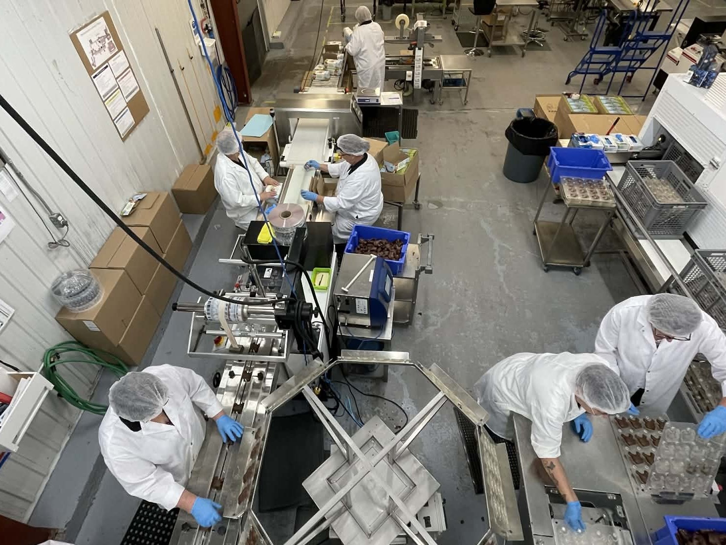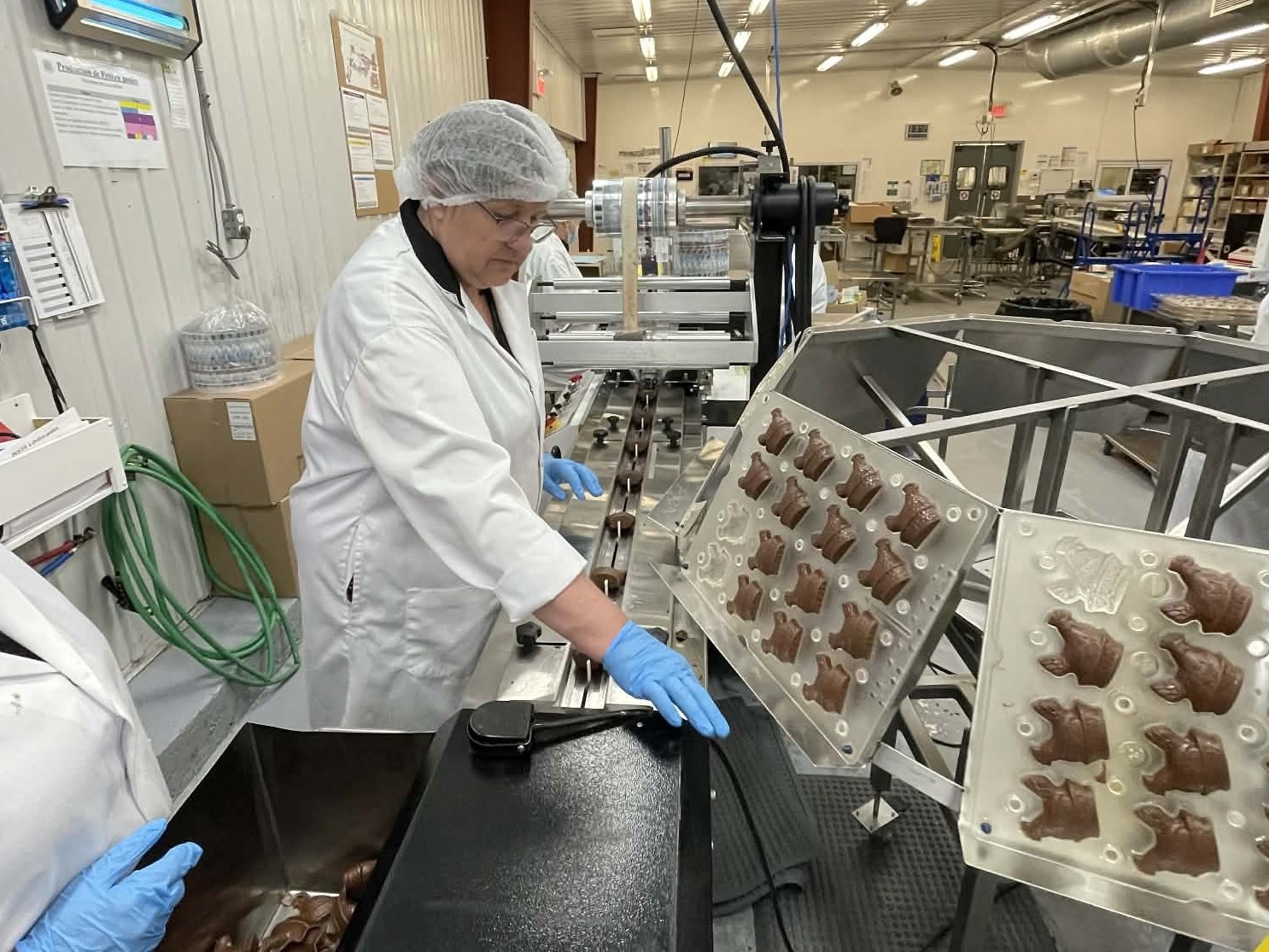 Lorsque la production de chocolat de Pâques débute, aucune commande n’est encore entrée. Il faut attendre environ trois mois avant de voir arriver les premières. Sur le plancher, sept employés s’affairent à la fabrication des figurines, que ce soit à la tourneuse ou à l’emballage. Un superviseur veille au bon déroulement de l’ensemble des opérations.