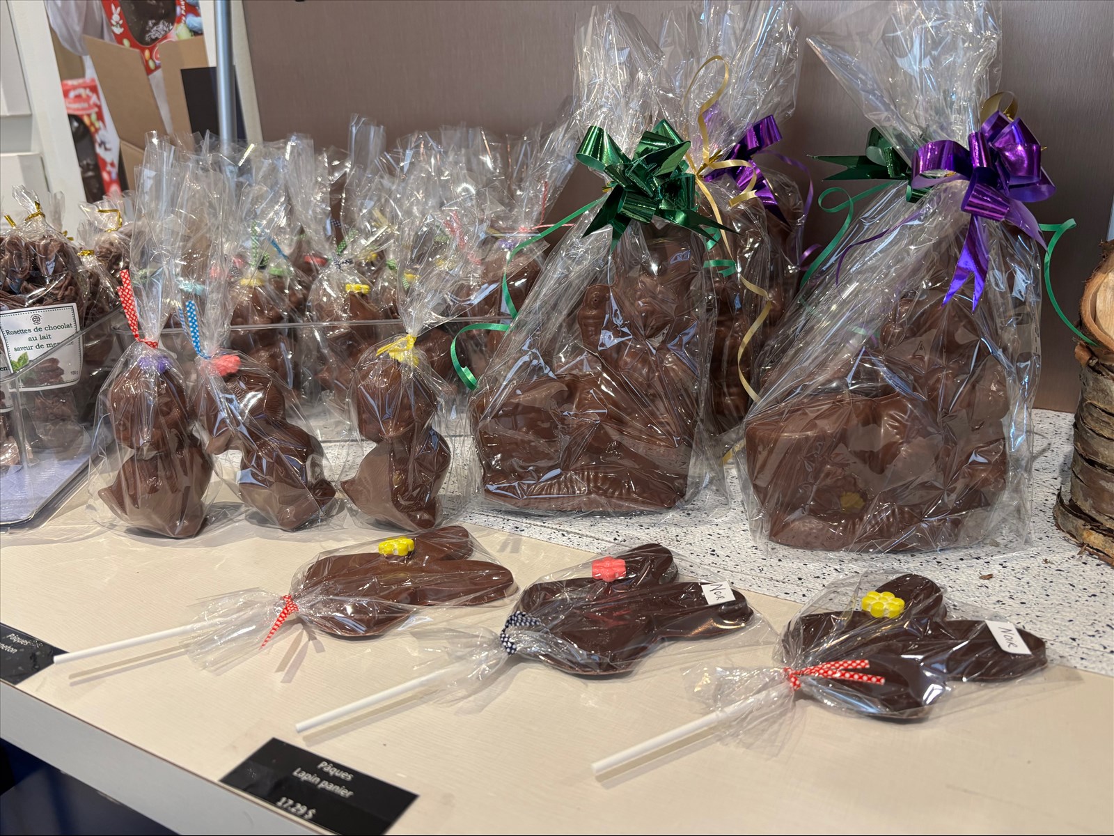 La Chocolaterie des Pères offre une douzaine de figurines différentes, allant du coq au lapin, du chat à l’ourson, du caniche à l’écureuil, toutes de formats différents. Sans oublier le grand classique et meilleur vendeur : la petite poule en chocolat au lait.