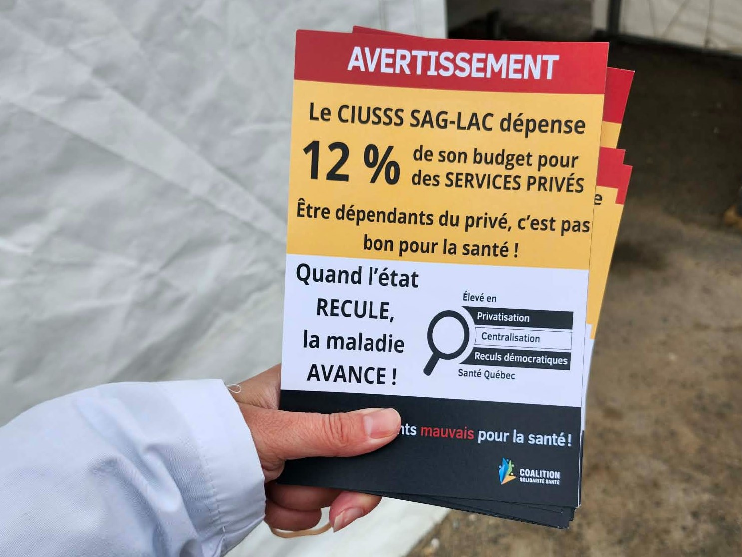 Dans la région du Saguenay–Lac-Saint-Jean, la coalition composé d’organisations communautaires, syndicales et citoyennes, était, hier, devant des centres de prélèvements pour distribuer des tracts d’information sur les enjeux entourant l’état du système de santé.