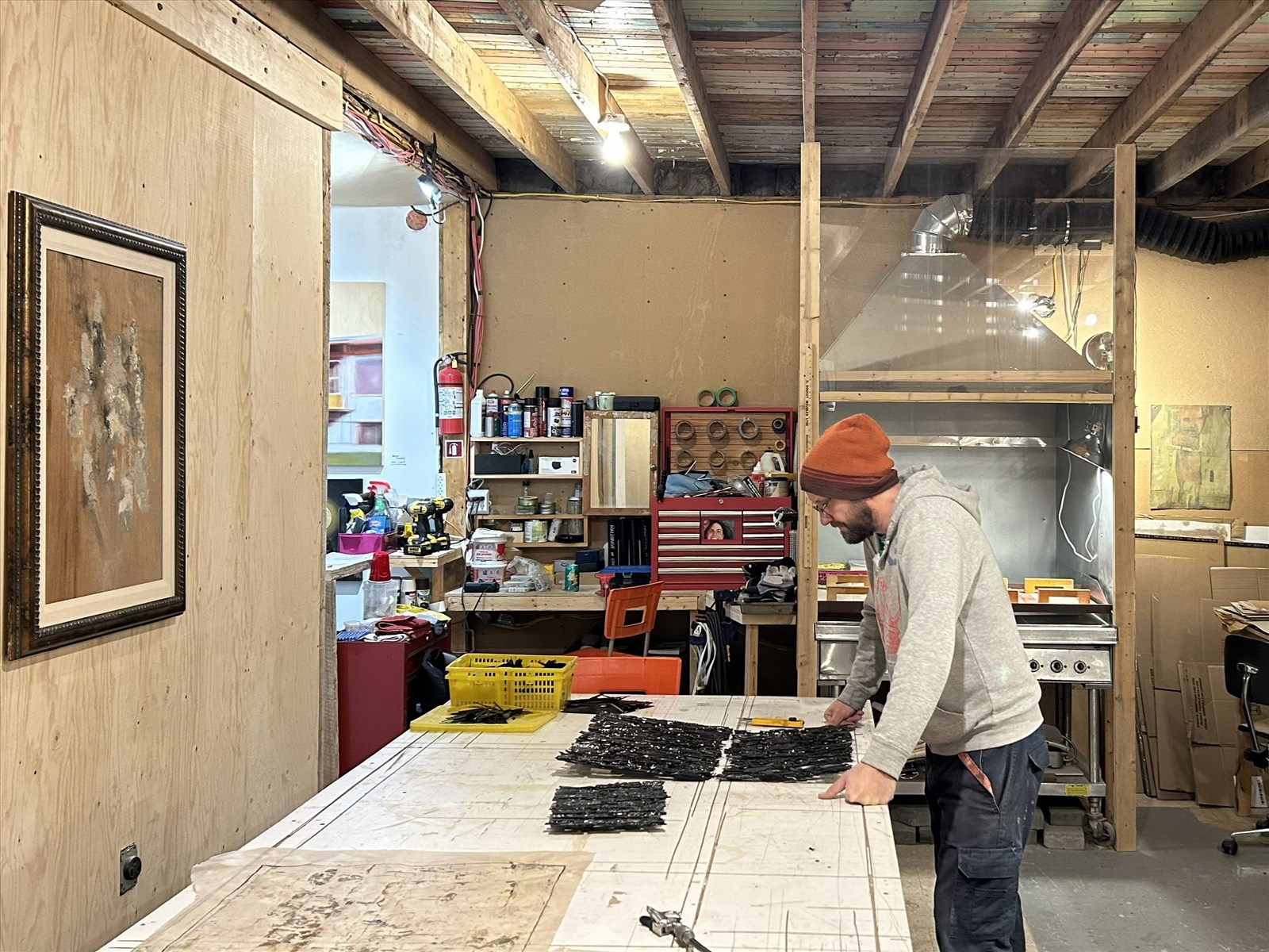 De retour dans sa région natale en 2021, Éric Villeneuve s’investit pleinement dans sa pratique artistique. Établi à Normandin, il inaugure, trois ans plus tard, une galerie d’art en collaboration avec son frère Martin. C’est dans l’atelier attenant à cet espace d’exposition qu’il prépare sa quatrième exposition solo, grâce au soutien d’une bourse du Conseil des arts et des lettres du Québec.