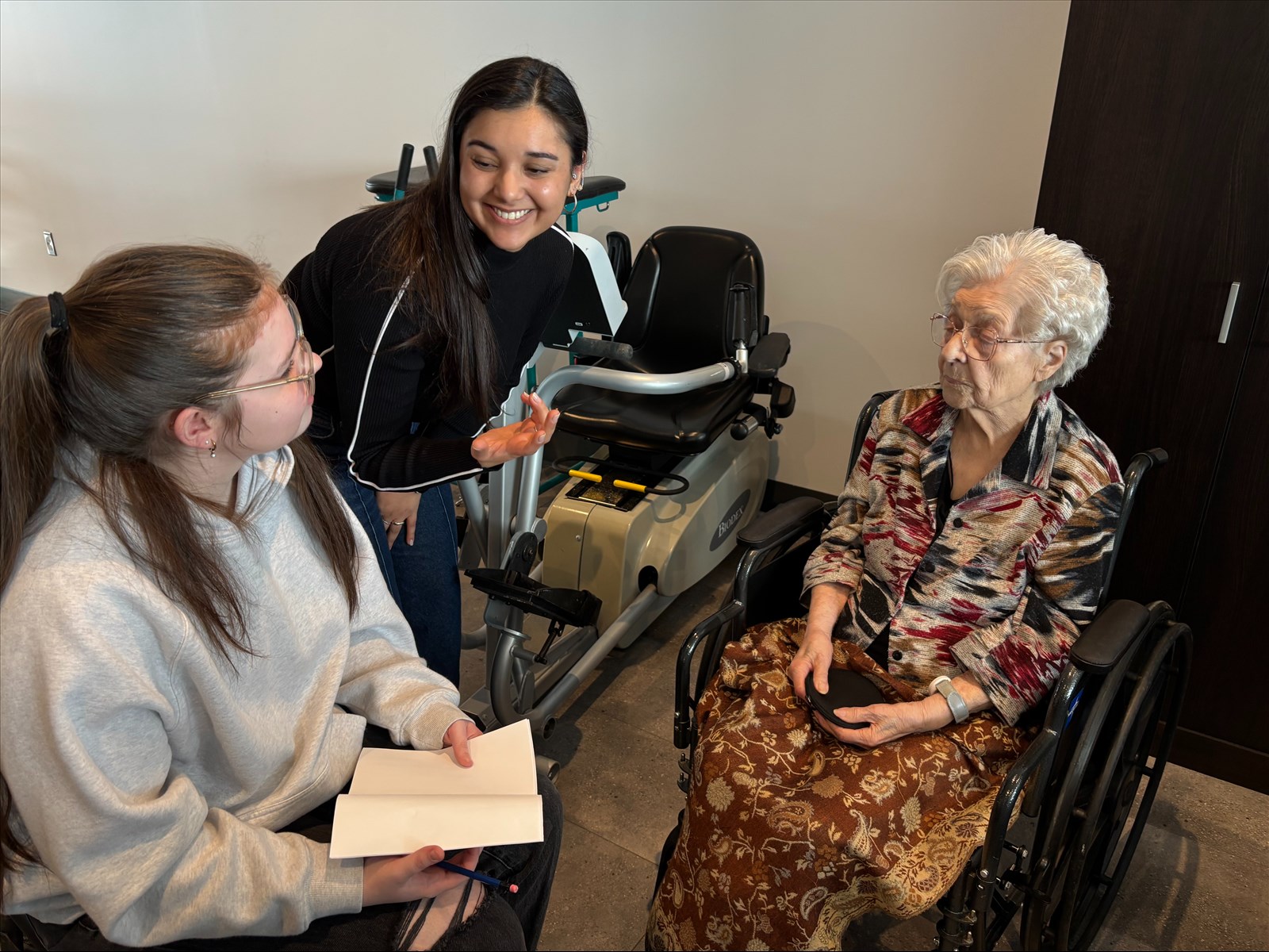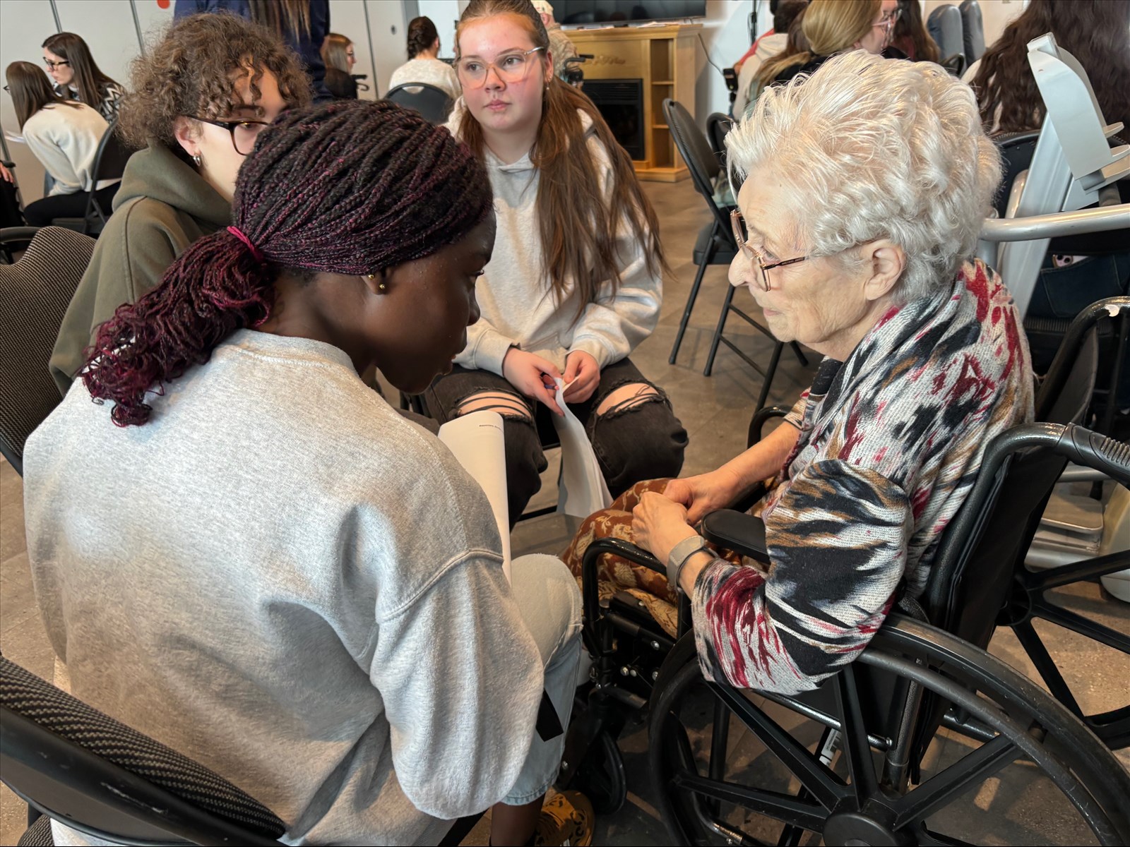 Les élèves de quatrième et de cinquième secondaire de l’école des Grandes‑Rivières se sont ensuite réunis en sous‑groupes. Ils souhaitaient en apprendre davantage sur l’héritage, les expériences et les apprentissages des aînés. Le hasard a voulu que Rose, Mélodie et Elva s’assoient près de la résidente Marie-Alice Simard.