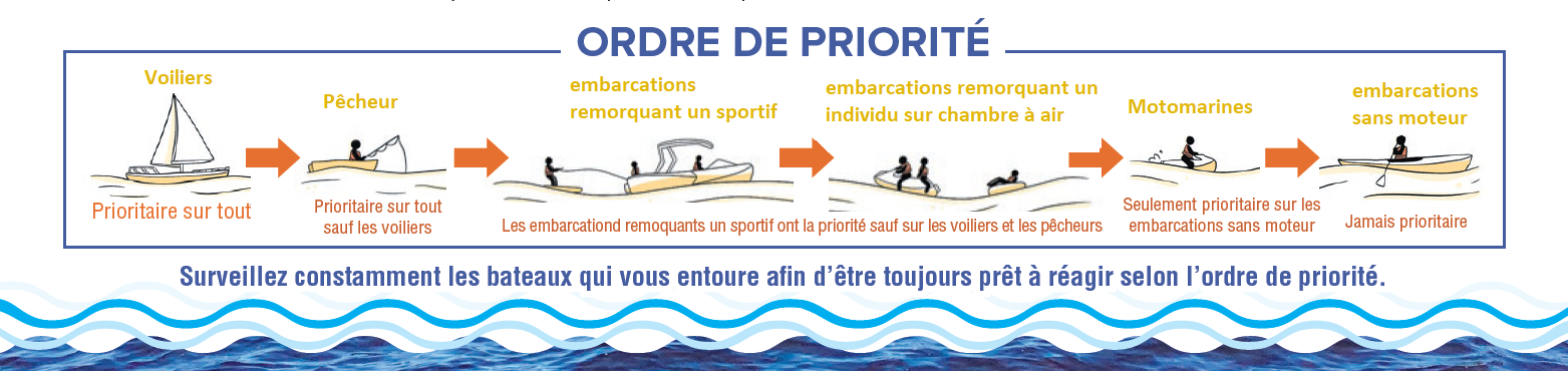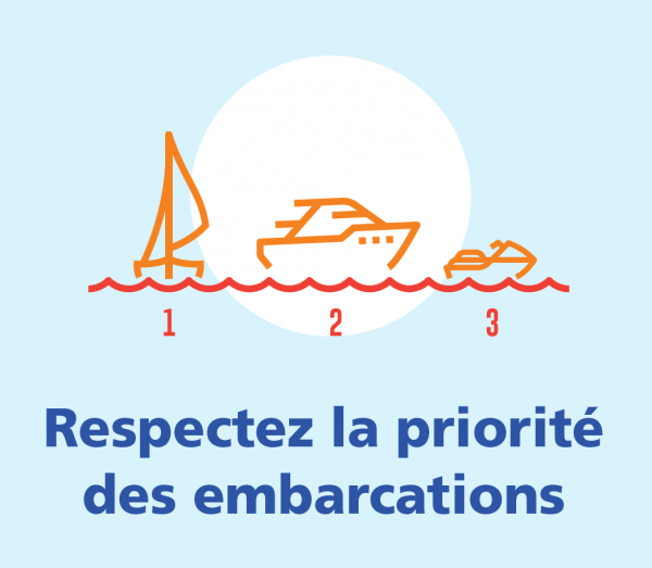 Malgré l’absence de routes et de structures apparentes, la navigation des bateaux sur l’eau est encadrée par des règlements spécifiques. Il existe une véritable hiérarchie entre les différentes embarcations qui a pour but d’éviter les accidents nautiques. Il est de votre devoir de connaître la priorité des embarcations afin de céder le passage au bon moment et ainsi éviter les collisions. De façon générale, plus une embarcation peut changer de cap rapidement, moins elle sera prioritaire.
