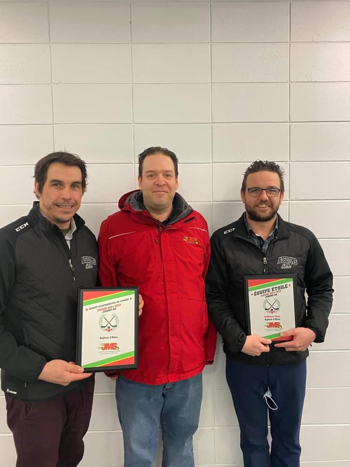 Le prix du meilleur groupe d’entraineurs de l’année a été décerné à celui des Aiglons d’Alma, qui est composé de Guillaume Guay (entraineur-chef), Pierre-Luc Fortin (entraineur-adjoint) et de Jean-Philippe Fortin (entraineur des gardiens de but).